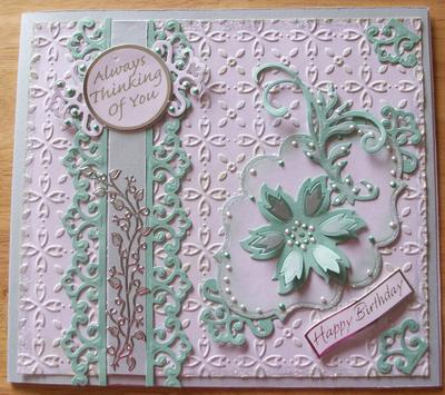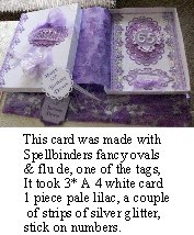I think the other two are lilac, purple and white, again A4 white card *2 sheets mauve * 2 sheets, and one purple foil, and again all Spellbinders dies.