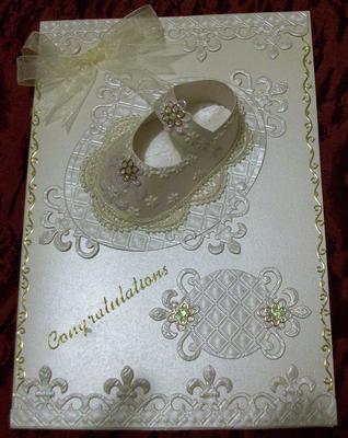 The cream Baby shoe was made from two sheets of cream card one of ivory, and Fleur De Lis die cuts, and gold stickers.