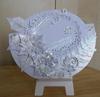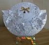 I used two 12*12 gold card for the box, plus white lace and satin ribbon, Spellbinders Grand Decorative Ovals, and a card creator on the inside, plus 4 x 4 white card two of which were embossed.