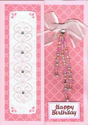 The card is of just plain pink and white. I used the Houghie Board to create the embossed lines, dotted the crossed parts with lacquer.