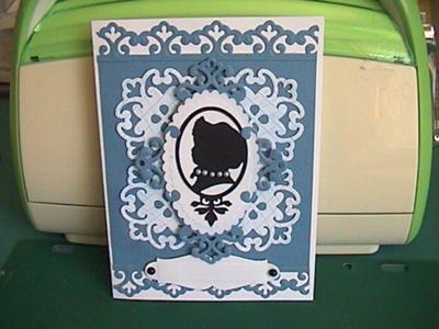 The cameo is cut on my friends cricut machine. I used the small scalloped die cut and added pearls around the neck. The tag is a grommet tag.