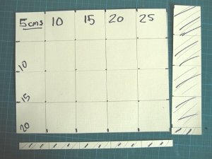 As this is my template I have used bold lines so that you can see the markings. I have marked the card at 5cms intervals. The shaded part of the card is surplus and can be cut off.