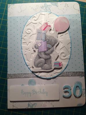 I love the green that has been used for this card, and the embossed background to the bear makes him stand out.